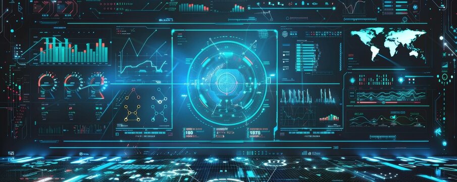 A high-tech dashboard showcasing various data visualizations, including bar graphs and digital maps, illuminated in blue and cyan tones.