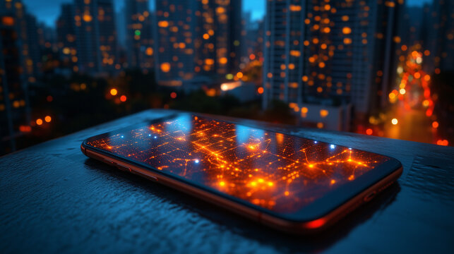 Futuristic data network interface over city skyline