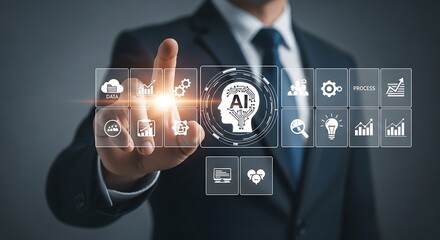 Man pressing virtual interface with modern technologies, business advancement, data, and machine learning for futuristic applications and growth.