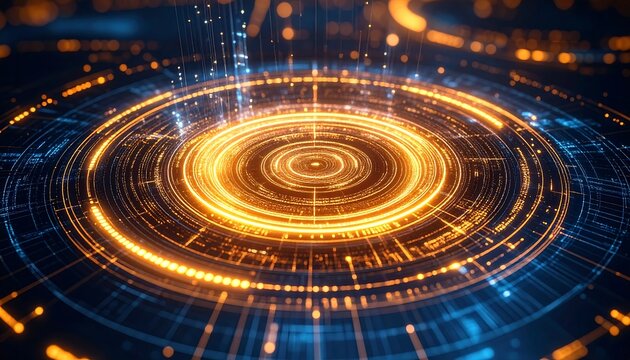 Abstract digital technology background with vibrant circular patterns and glowing lines