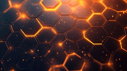 Close-up of glowing hexagonal grid with orange light accents on dark background creating futuristic and technological atmosphere