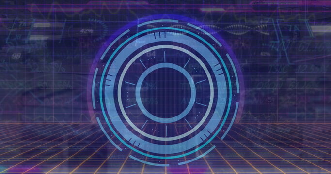 Image of text blue circular scope over scope rotating and data processing