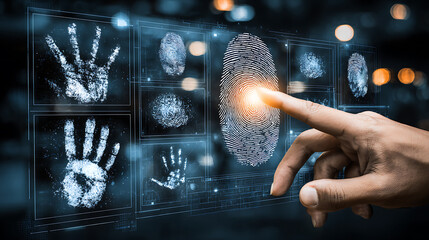 A hand interacts with a digital interface displaying fingerprint and palm scan patterns in a high-tech biometric system.