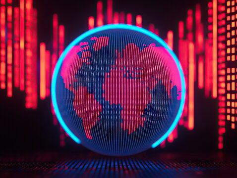 A captivating digital globe visualization showcasing interconnected networks across continents, emanating a futuristic aura.