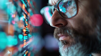 An immersive scene displaying dynamic financial charts and data streams, accented with bright, neon colors against a dark backdrop.