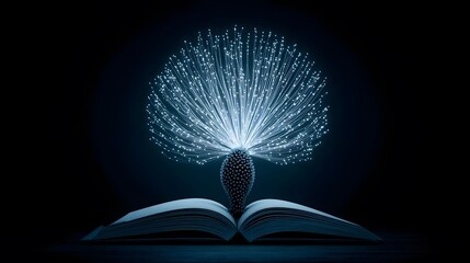 Holographic knowledge galaxy: Floating data particles forming book shapes with translucent interface panels displaying cybernetic trees. Blue-silver futuristic palette in fluid geometric style for met