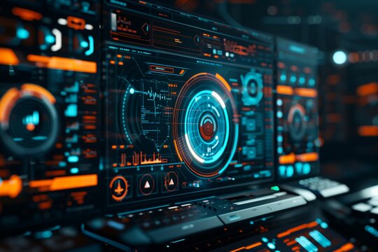 Close-up shot of a futuristic digital interface displaying various data, graphs, and charts in shades of blue and orange.