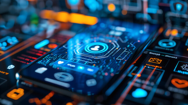 Digital concept of a mobile phone and computer screen displaying cyber security symbols, data protection and online safety technology background with glowing hologram icons