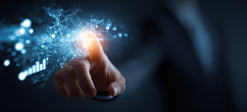 Man in suit hand touches glowing digital interface network. Person interacts with abstract futuristic data system. Cybernetic connection, information flow.