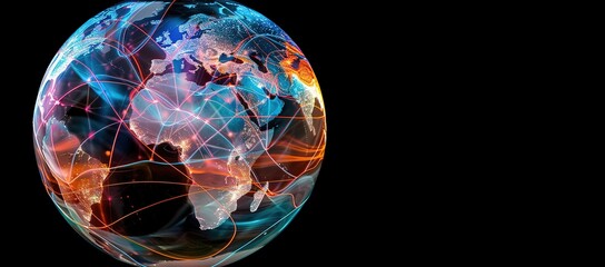 A vibrant, glowing Earth encircled by neon rings, set against a dark, futuristic backdrop.  The image suggests global connection and technological advancement.