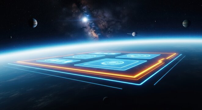Satellite technology in space with digital interface and earth backdrop