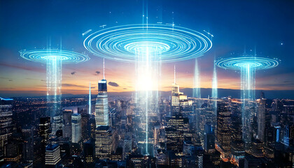 Stunning aerial view of a futuristic cityscape at twilight, illuminated by vibrant digital streams and glowing circular interfaces above.