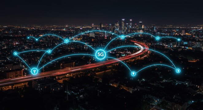 Global network connection over a futuristic cityscape with light trails on a busy highway at dusk