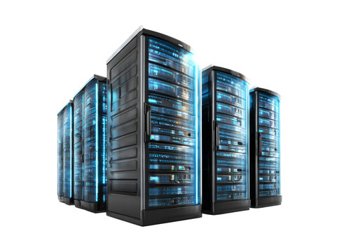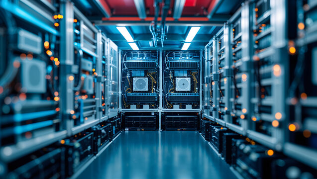 Futuristic data server room with glowing blue lights and high tech digital cloud computing network infrastructure for information storage and security