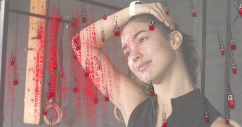 Woman working in store with digital binary code overlay