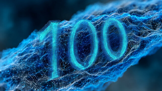 A digital rendering of the number 100 floating in a blue, textured environment