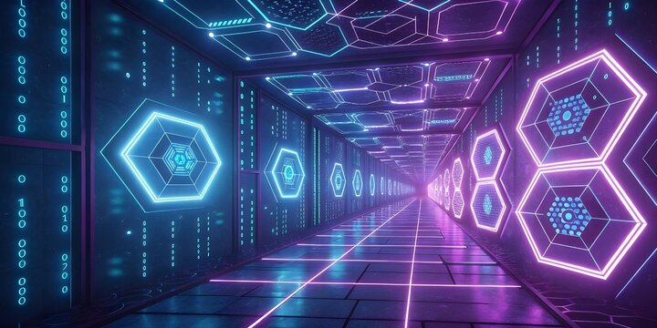 Futuristic tunnel with neon lights and hexagonal shapes in a digital space