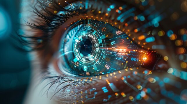 A close-up photo of a human eye with a futuristic digital overlay, suggesting the future of technology and its integration with the human body.
