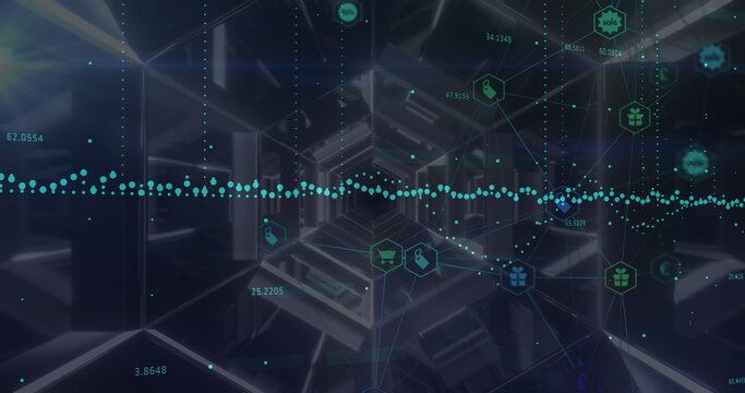 Data processing and network of digital icons over hexagonal tunnel against black background