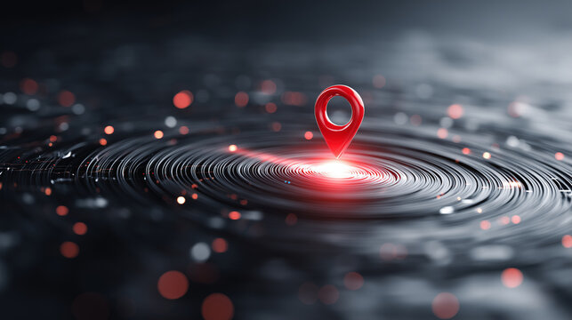 Glowing red location pin hovering over a digital surface symbolizing GPS navigation and tracking technology.
