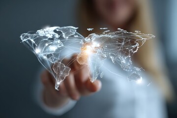 A hand hovers over a digital world map, overlaid with data connections and city lights.  Intricate network of global connections.  Abstract, futuristic,  technology concept.  Interactive touch