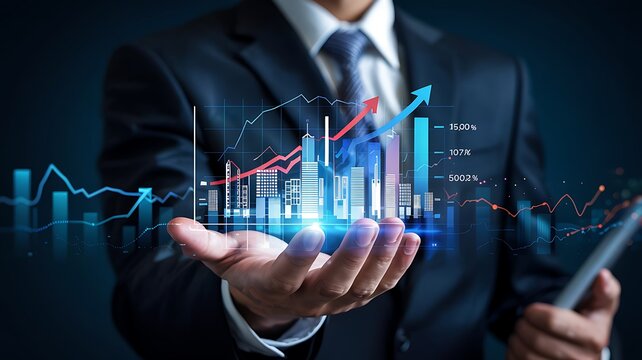 Businessman analyzing financial report with virtual stock market chart overlay in futuristic digital interface on dark background.