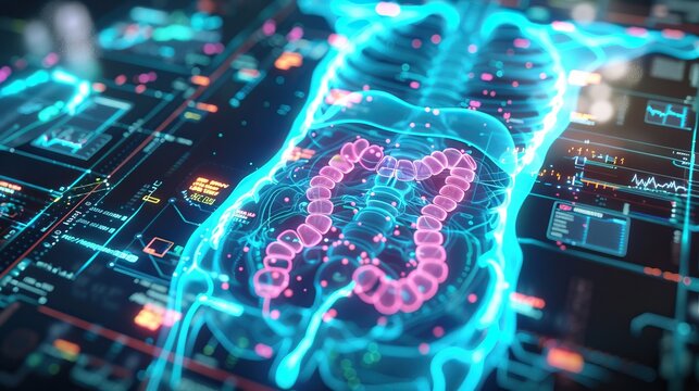 A futuristic display of an intestinal Xray overlaid with Matrixstyle digital code, emphasizing the integration of advanced computing in medical diagnostics
