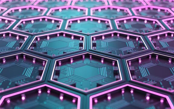 A futuristic surface is composed of interlocking hexagonal tiles featuring complex circuitry details. Glowing blue and red lights trace the geometric patterns, suggesting high-tech data processing or