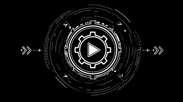 A stark digital rendering showcasing a gear mechanism with a play button icon at its center, surrounded by curved lines and arrows on a black backdrop
