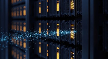 Data flow tunnel with glowing walls, digital information, server room background, tech visualization