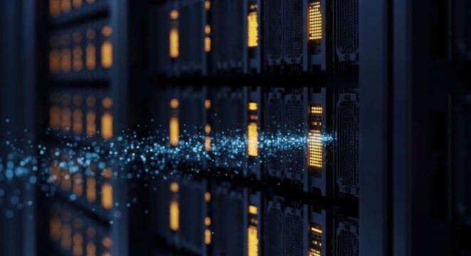 Interior of a data center managed by AI, with glowing servers and data streams .