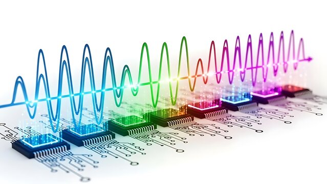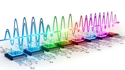 Advanced digital visualization of colorful data waves flowing over intricate semiconductor chip circuitry representing high-tech electronic signals and processing