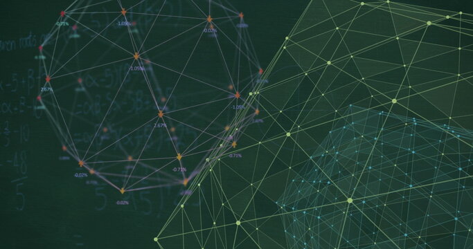 Image of financial data processing over shapes on black background
