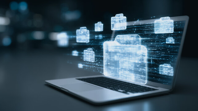 A futuristic image captures the essence of digital organization, with files floating from a laptop, emphasizing data management and technology in a modern workspace.