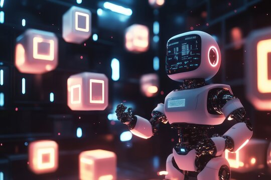 Highly detailed 3D render of a digital figure surrounded by futuristic elements and data visualization symbolizing the advanced machine learning and intelligence technology of the future