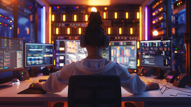 A male IT worker sits at his desk in front of computer monitors and looking computer screen, seen from behind and looking over the of an AI system that processes data on monitor displaying code