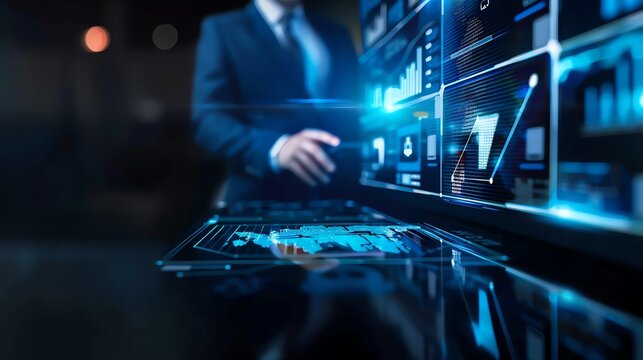 A business professional interacts with an advanced digital interface, showcasing data analysis and futuristic technology.