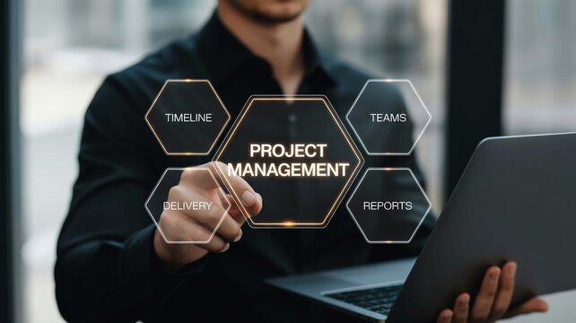 Dynamic businessman interacts with futuristic holographic interface displaying key project management elements like timeline delivery teams and reports for modern business success