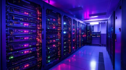 Powerful data servers humming in a modern data center with vibrant blue, green, and orange lights indicating optimal performance and secure connectivity