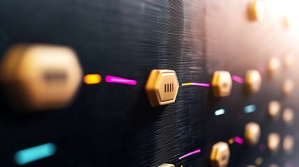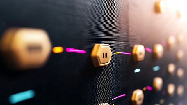 Gold hexagonal buttons, futuristic technology, server room, data processing