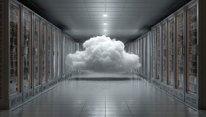 Digital cloud data storage concept with server room background. Futuristic cloud computing technology, data processing, networking, information tech infrastructure. Business, finance, innovation,
