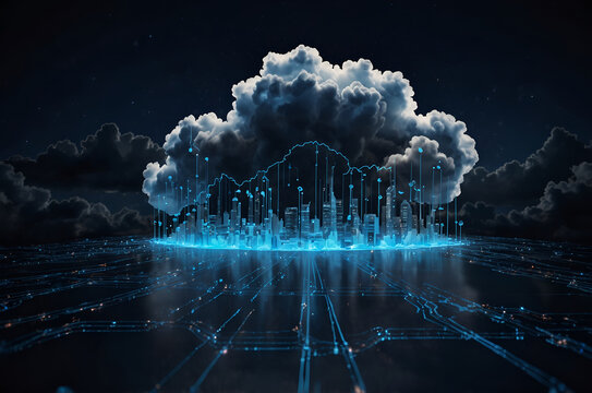 Cloud computing technology concept. Smart city and digital cloud data center.Futuristic big data processing cloud