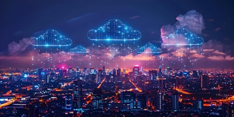 Futuristic Cityscape with Digital Clouds Representing Data Centers Symbolizing Widespread Cloud Computing Adoption