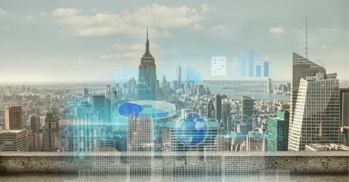 Futuristic digital interface overlaying a cityscape, showcasing data visualization and global connections.