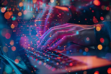 Hands typing on a laptop with a sparkling data stream overlay, depicting modern digital technology and information processing in a dynamic setting.