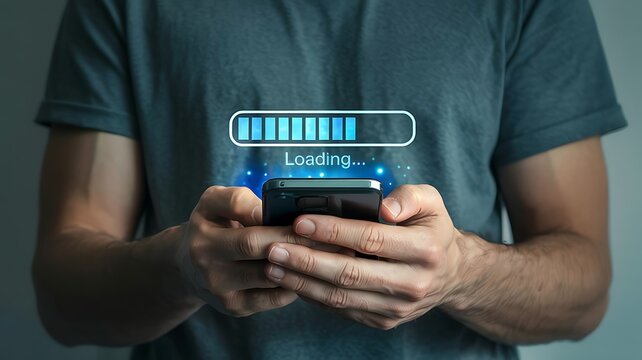 Hands holding a loading bar with loading text in a digital futuristic style on transparent background