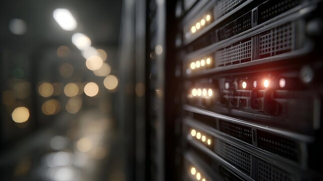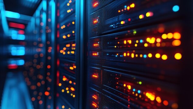 Rows of server racks with blinking status lights illuminate a modern dimly lit data center