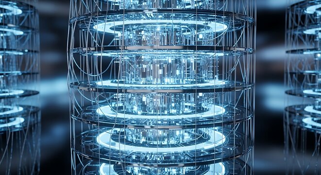 Futuristic glowing blue server racks in a data center, symbolizing advanced computing power, digital storage, and network infrastructure