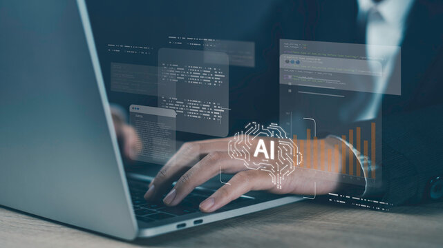 AI programming and assistant concept showing typing on laptop with digital interface overlays, including code, data analytics, and artificial intelligence icons for innovation and tech development.
