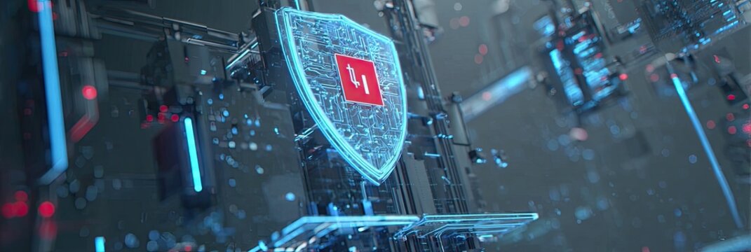 A digital security shield floats amidst a complex network of illuminated circuit boards